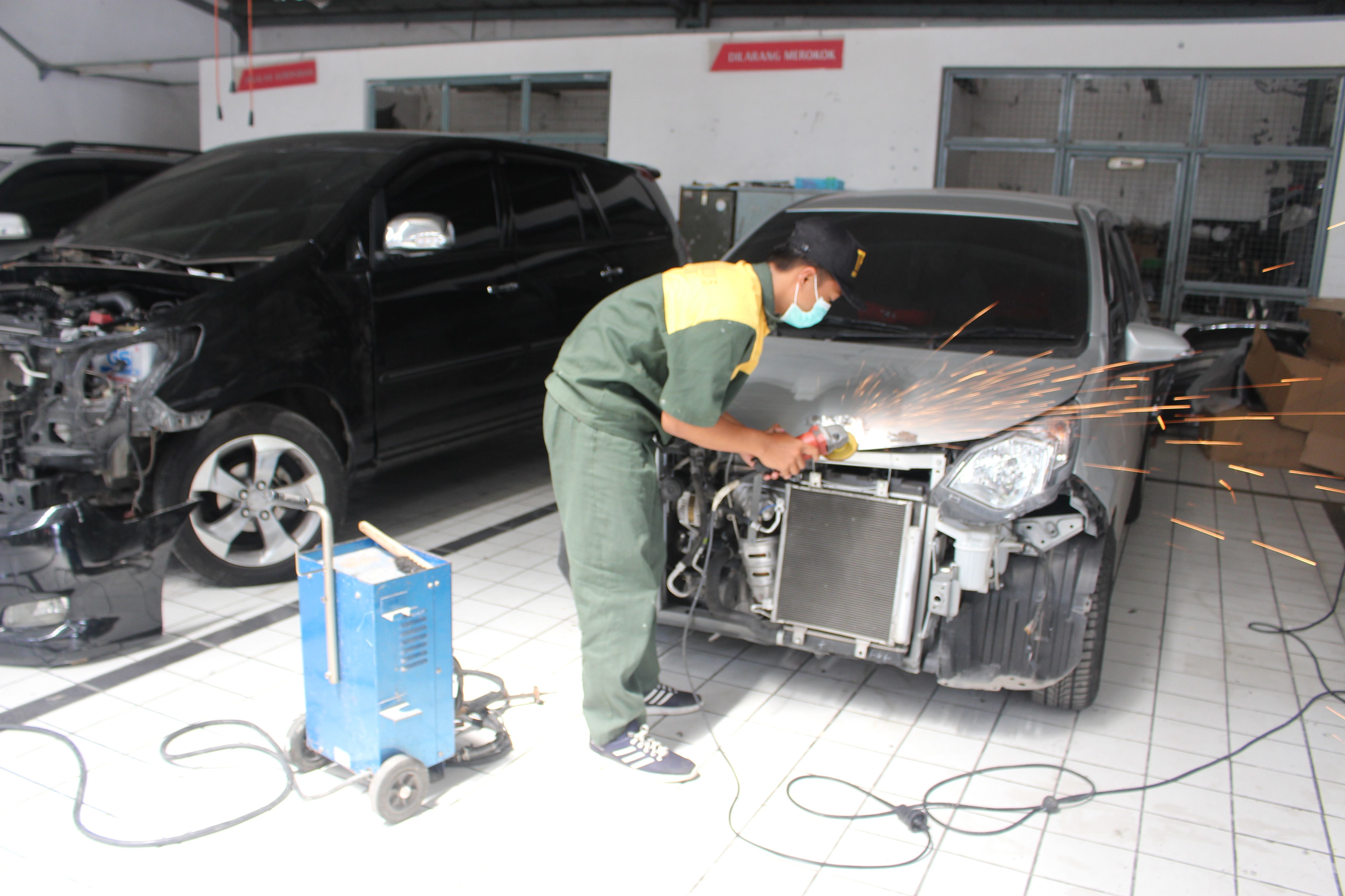 Praktek di bengkel perbaikan bodi otomotif, disini peserta didik diajarkan cara mendempul, mencampur cat, cara mengecat ...